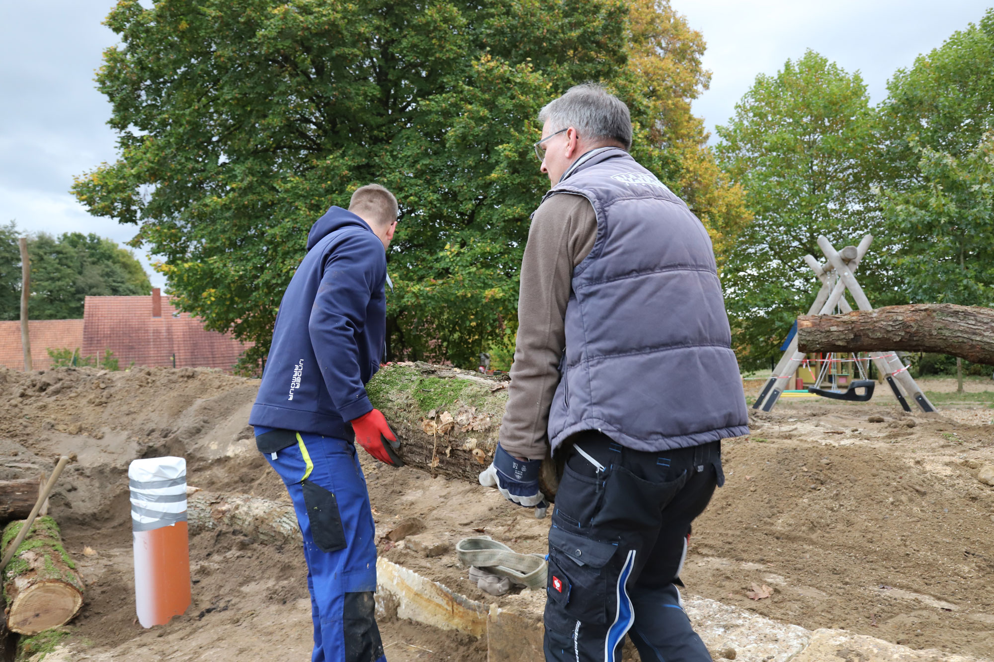 Das Außengelände der Kita Sternschnuppe nimmt Formen an: Ute Röhling, Geschäftsführerin der Eltern-Selbsthilfe-Gruppe (ESG) Bad Oeynhausen, und Erzieherin Heike Frankfurt (rechts) zeigen Klaus Schäfer von der Sparkasse Bad Oeynhausen-Porta Westfalica, was Eltern, Kinder und das Kita-Team bereits geschafft haben.